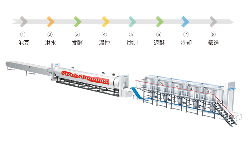 24款炒豆生產(chǎn)線是天元星研發(fā)團(tuán)隊(duì)的又一成果,目前在國(guó)內(nèi)未發(fā)現(xiàn)有類似的生產(chǎn)工藝,從泡豆、淋水、發(fā)酵、溫控、炒制、返酥、冷卻、篩選等工藝全部實(shí)現(xiàn)了數(shù)字化控制。