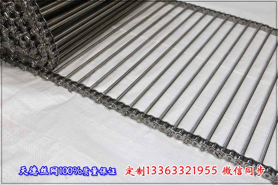 鏈桿輸送帶可采用碳鋼、不銹鋼201/304/316不銹鋼材料,以鏈條傳動,鏈條可選用標準鏈條和雙節(jié)距輸送鏈條使網(wǎng)帶受力減小容易安裝網(wǎng)帶的附屬配件,如擋板,側(cè)翼,用于輸送固體物料,通透性好,易清洗. 旋的繞絲串起來形成平衡編織的輸送網(wǎng),螺距能做到3毫米,每1米寬網(wǎng)帶有333個圈。節(jié)距能做到6毫米,每1米網(wǎng)帶長有166根曲軸。 該網(wǎng)帶通常網(wǎng)絲是圓的,但也可以制作成扁絲的。材料可選碳鋼、201不銹鋼、304不銹鋼、316不銹鋼等。