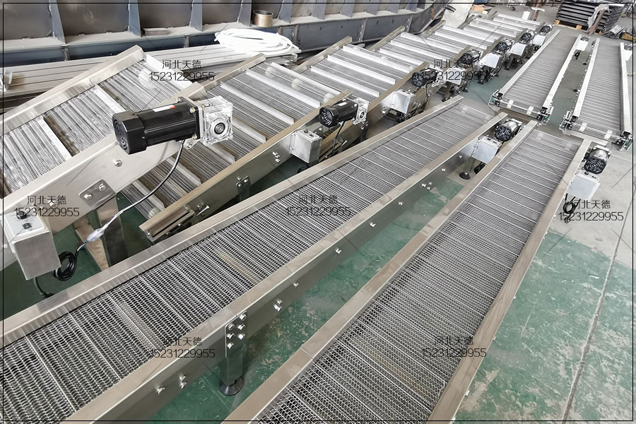 (3)鋼絲網(wǎng)帶 鋼絲網(wǎng)帶強(qiáng)度高,耐高溫。它具有網(wǎng)孔,網(wǎng)孔的大小可按需要選擇,多用于一邊輸送一邊固液分離的場合。如油炸食品爐中的物料輸送,水果洗滌設(shè)備中的水平輸送等常采用鋼絲網(wǎng)帶。鋼絲網(wǎng)帶用于烘烤食品設(shè)備中時,由于網(wǎng)帶網(wǎng)孔能透氣,故烘烤時食品生坯底部水分容易蒸發(fā),其外形不會因脹發(fā)而變得不規(guī)則或發(fā)生油灘、洼底、粘帶及打滑等現(xiàn)象。網(wǎng)帶上積累的面屑碳黑不易清洗,致使制品底部粘上黑斑而影響食品質(zhì)量。應(yīng)對網(wǎng)帶涂鍍防粘材料來解決。