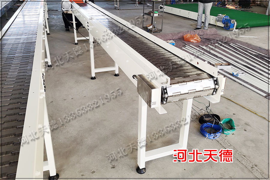 1)板鏈?zhǔn)窖b配流水線(鏈板輸送機(jī))特點(diǎn):承載的產(chǎn)品比較重,和生產(chǎn)線同步運(yùn)行,可以實(shí)現(xiàn)產(chǎn)品的爬坡;生產(chǎn)的節(jié)拍不是很快;以鏈板面作為承載,可以實(shí)現(xiàn)產(chǎn)品的平穩(wěn)輸送。