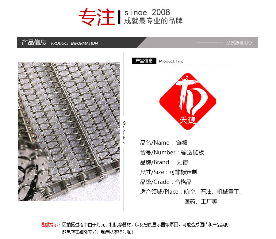 這種鏈桿式網帶采用鏈條傳動,適用于大型和重型傳送,其運動平穩、力量大,網面相對受力小,能對輸送網面起到保護作用,成本較貴,但使用壽命長。大開孔或者小開孔網條;溫度范圍零下55攝氏度到1150攝氏度;邊緣擋板和橫向擋板。